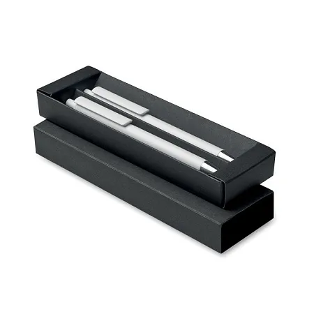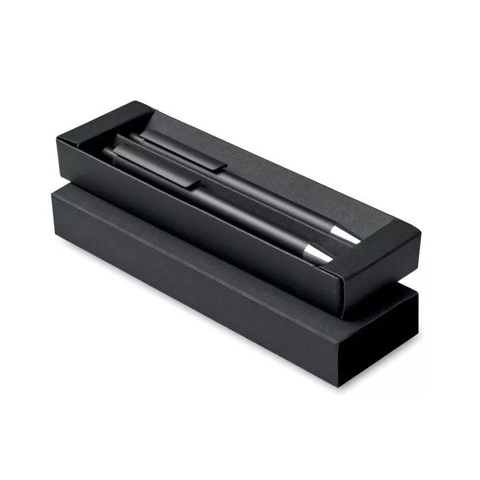 Recycled aluminium pen set with 1 push button ball pen and 1 graphite inkless pen. Blue ink. Presented in recycled paper box.