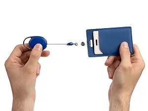 Ретрактор крепится к одежде с помощью карабина, а с другой стороны можно поместить бейдж, визитку или магнитную карту. В корпусе спрятан сворачивающийся шнур, который позволяет при необходимости демонстрировать содержимое держателя, не снимая его.