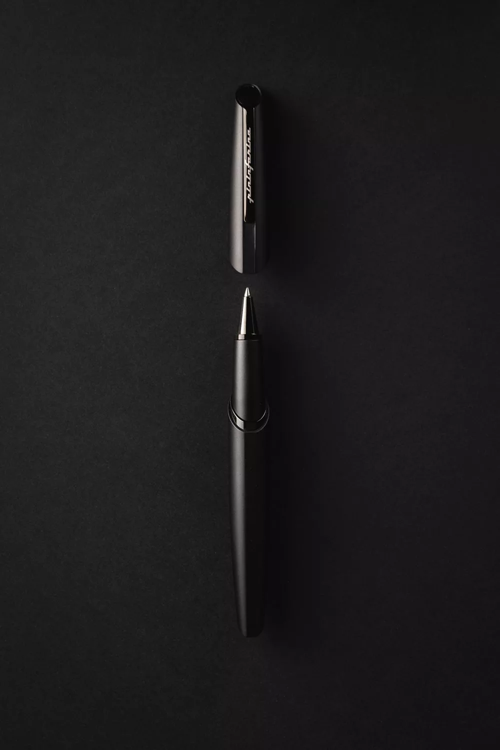 Роллер из коллекции 2021 года PF Two от дизайнеров Pininfarina. Точные геометрические формы и уникальное техническое исполнение ручки превращают ее из пишущего инструмента в совершенный аксессуар. Скошенные линии колпачка. Элегантное сочетание черного матового корпуса и глянцевого клипа на колпачке ручки. Корпус ручки выполнен из алюминия, ее длина 15 см, вес 40 гр. Упакована в серебристую округлую подарочную коробку. В ручке используется чернильный стержень Schmidt SRC 5888 с синей пастой.