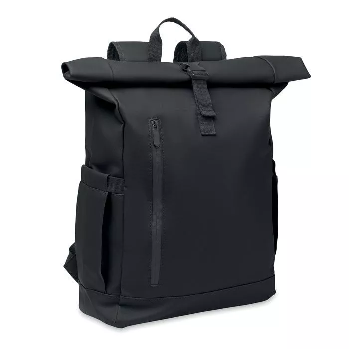 Roll top 15 inch laptop backpack in PU coated 600D RPET polyester and RPET polyester lining. Meshed padded back with zippered pocket and trolley strap. Padded shoulder strap with mesh inside finishing.