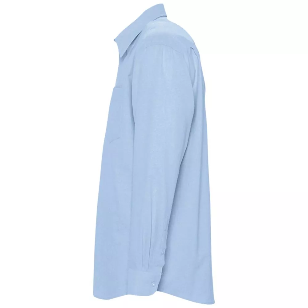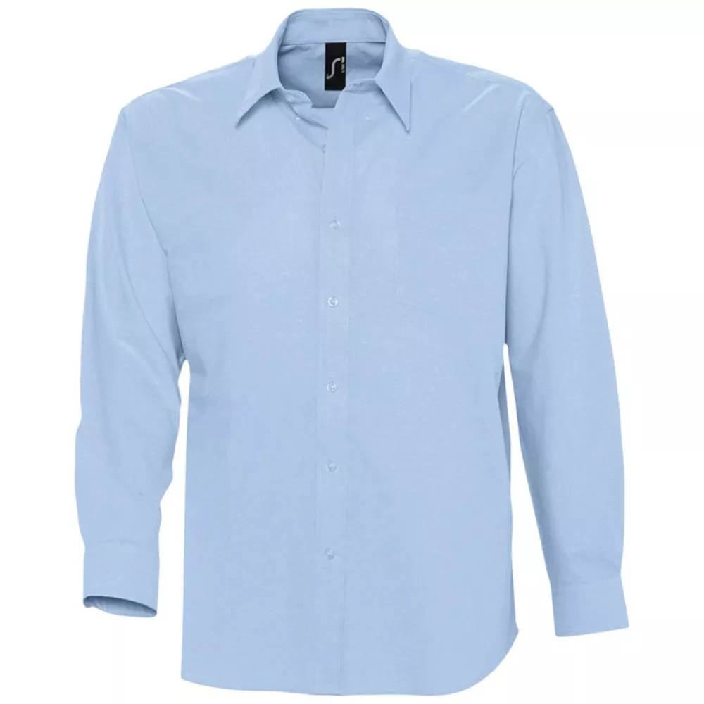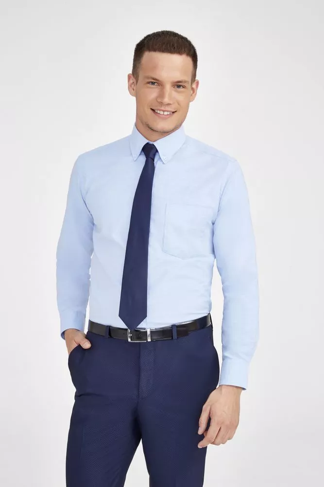 Рубашка из ткани «Оксфорд» с нагрудным карманом слева. На спинке две симметричные складки, воротник на двух пуговицах, регулируемые манжеты, планка с семью пуговицами в тон.