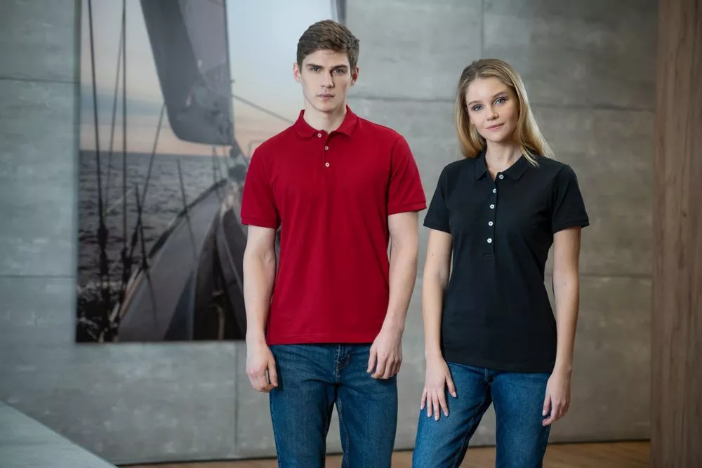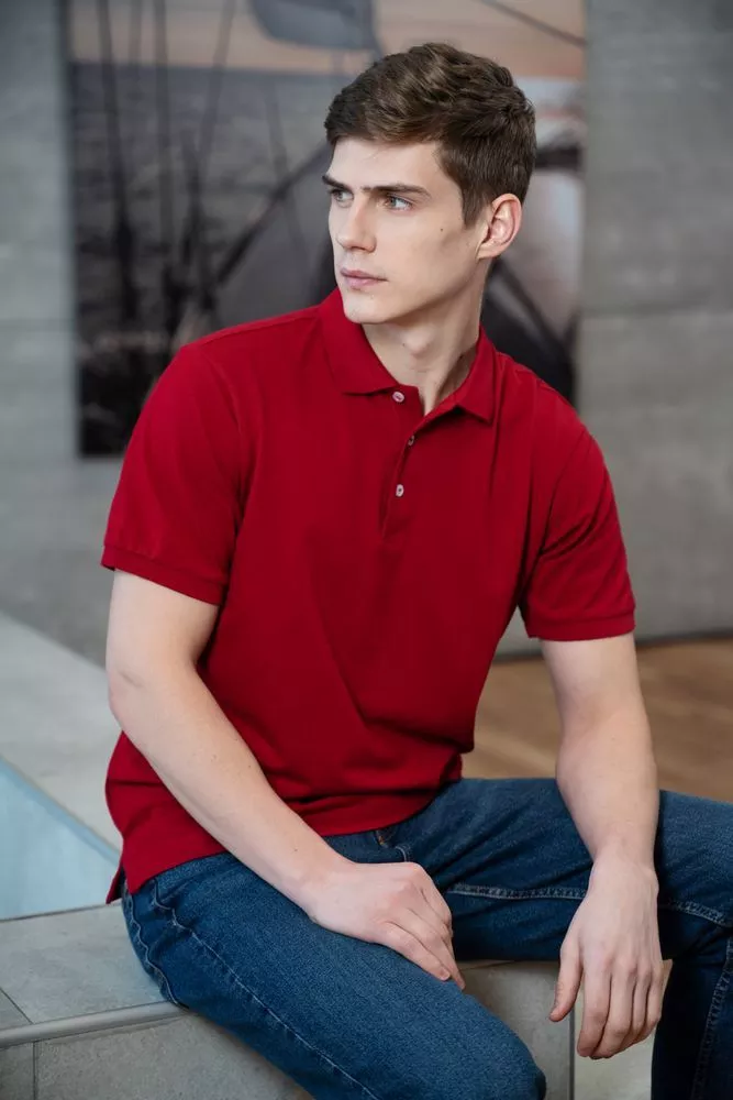 Классическая рубашка поло с разрезами по бокам. Застегивается на 3 пуговицы белого цвета.