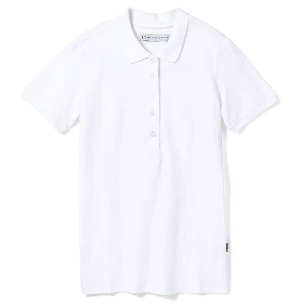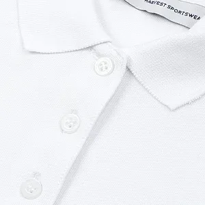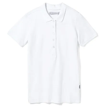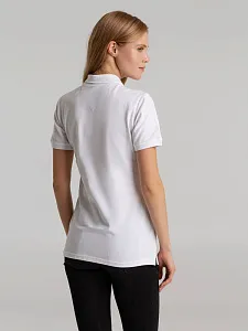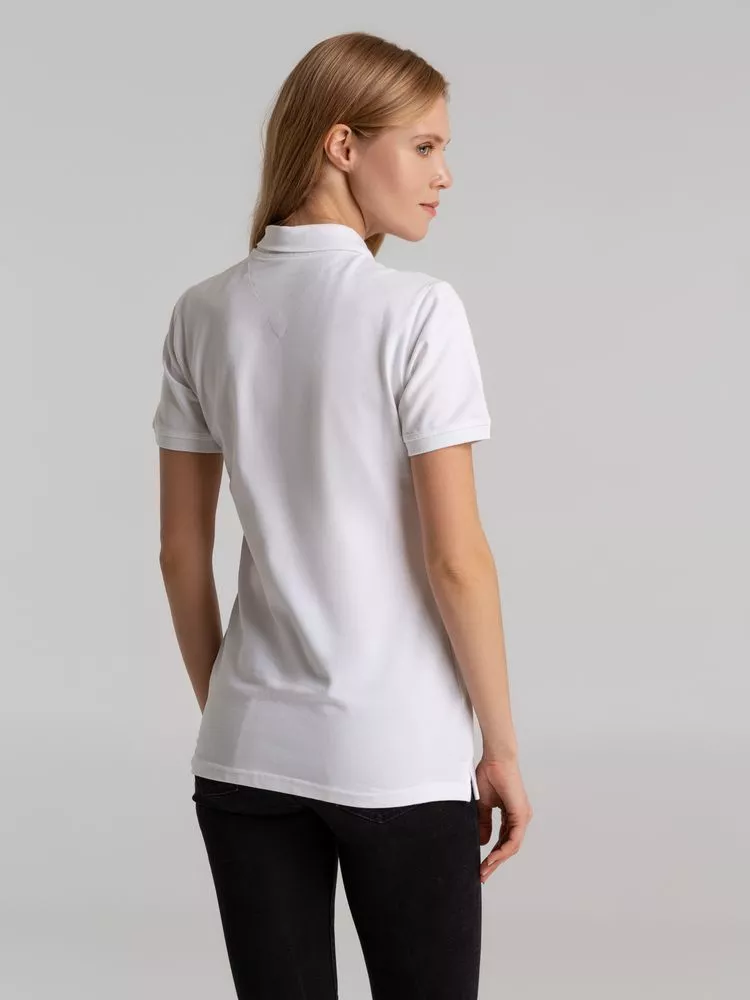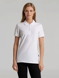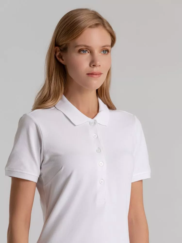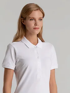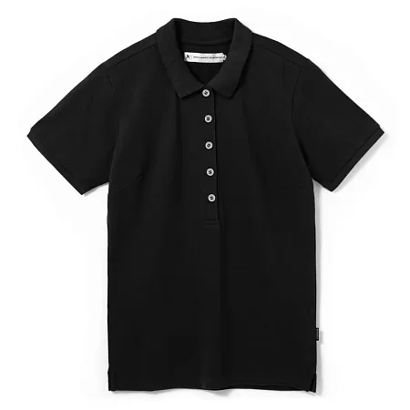 Приталенная женская рубашка поло с разрезами по бокам. Застегивается на 5 пуговиц белого цвета.