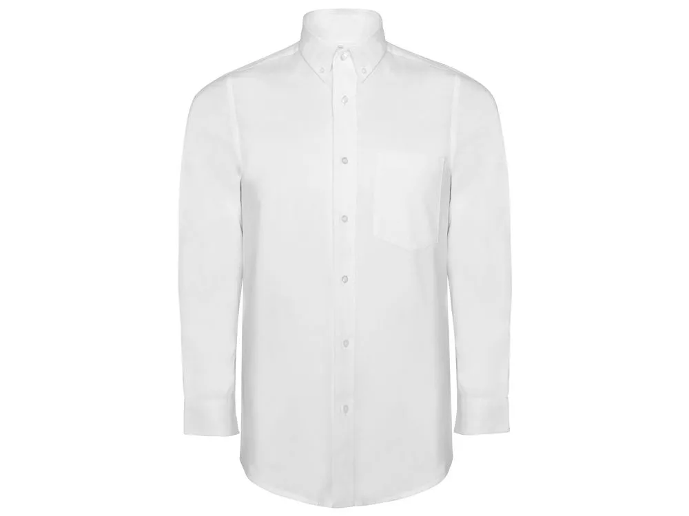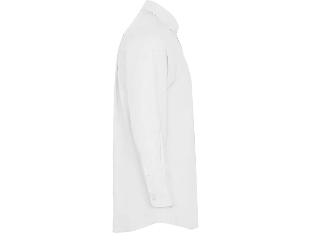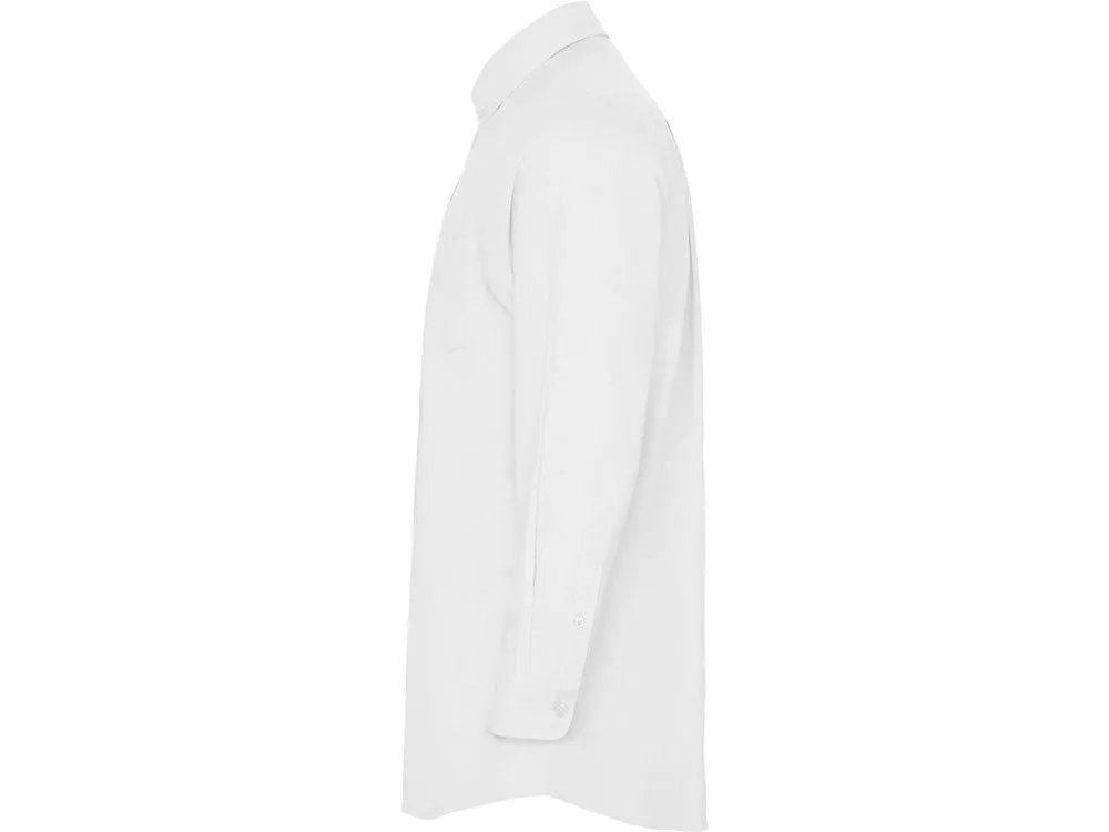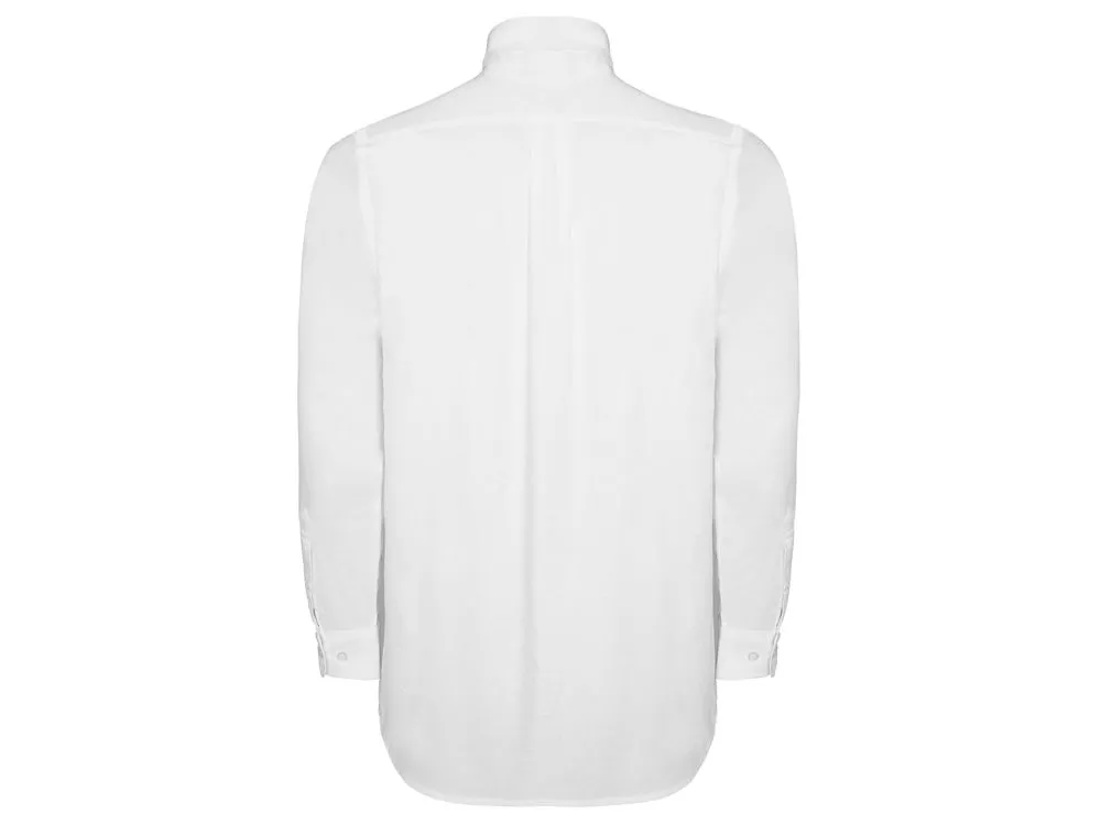 Мужская рубашка с длинным рукавом, накладной карман слева. Планка на пуговицах. Отложной воротник на стойке продублирован пуговицами. Манжета регулируется по ширине с помощью 2-х пуговиц. Кокетка на спинке.