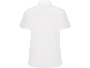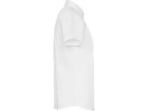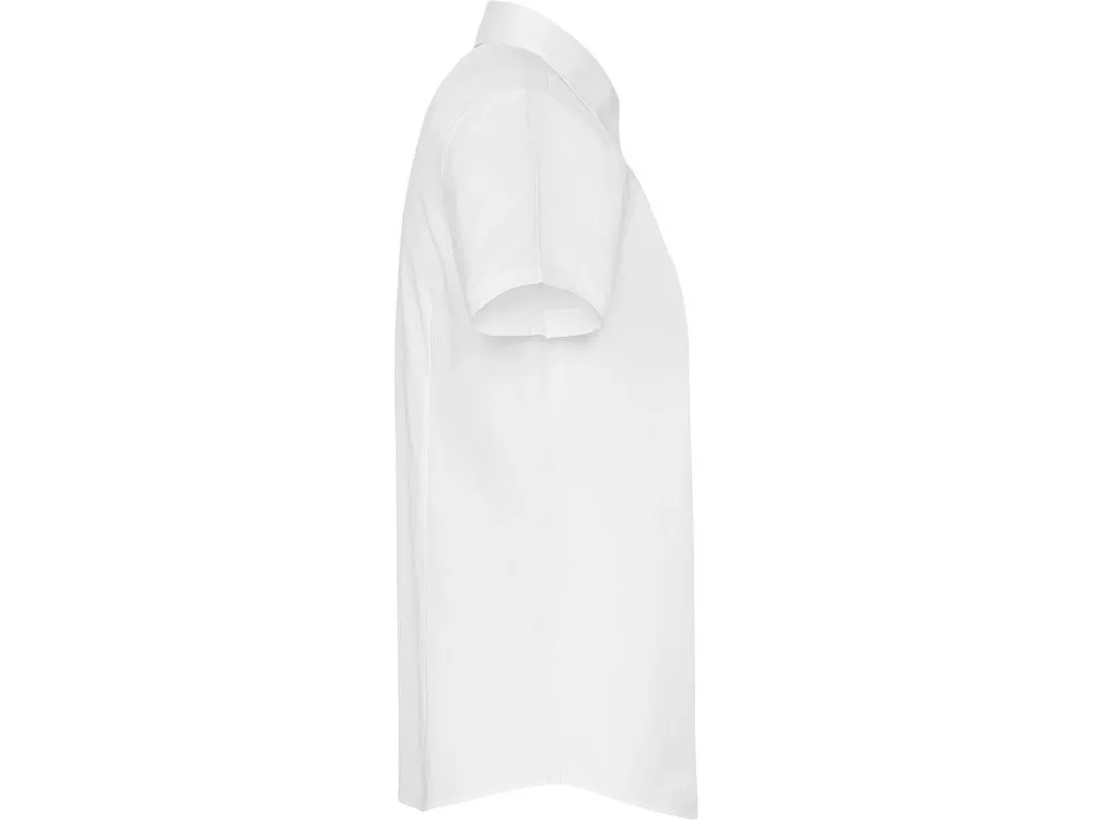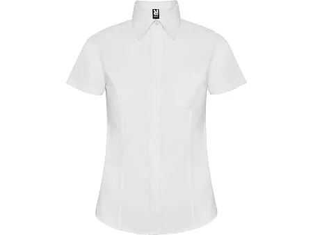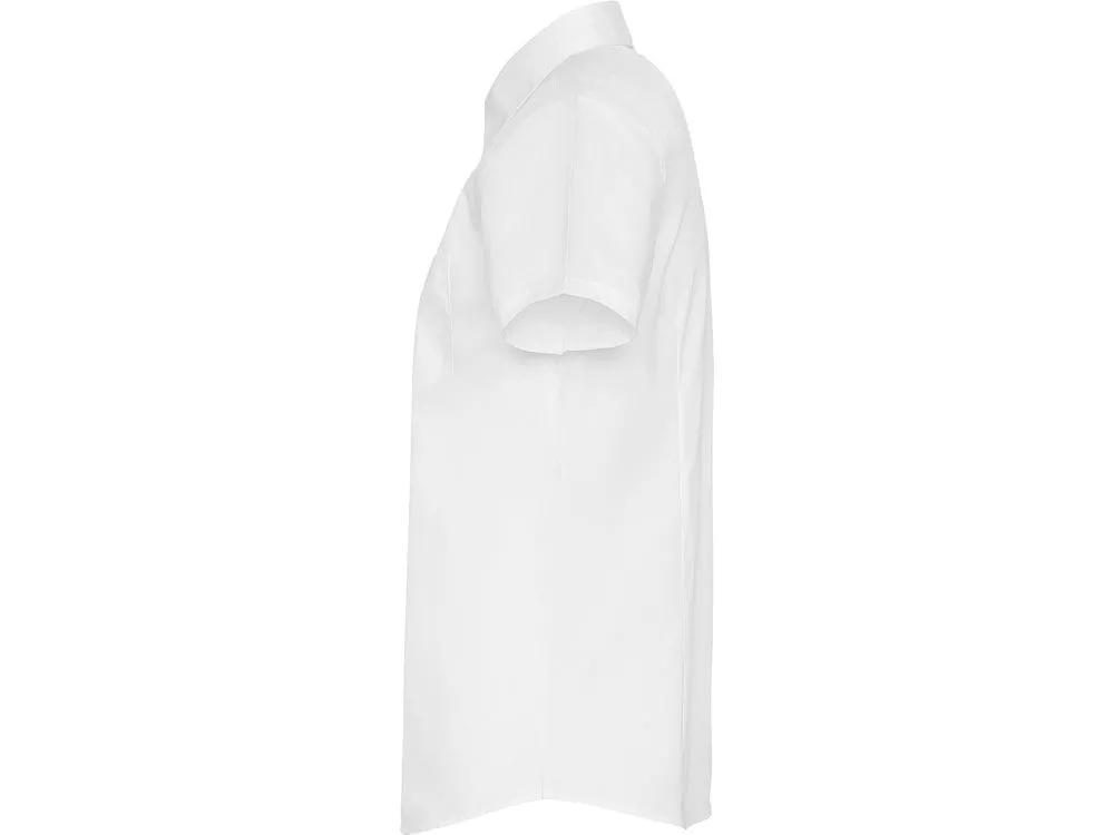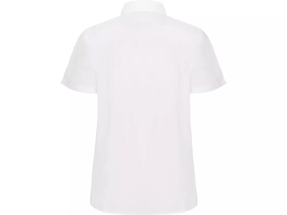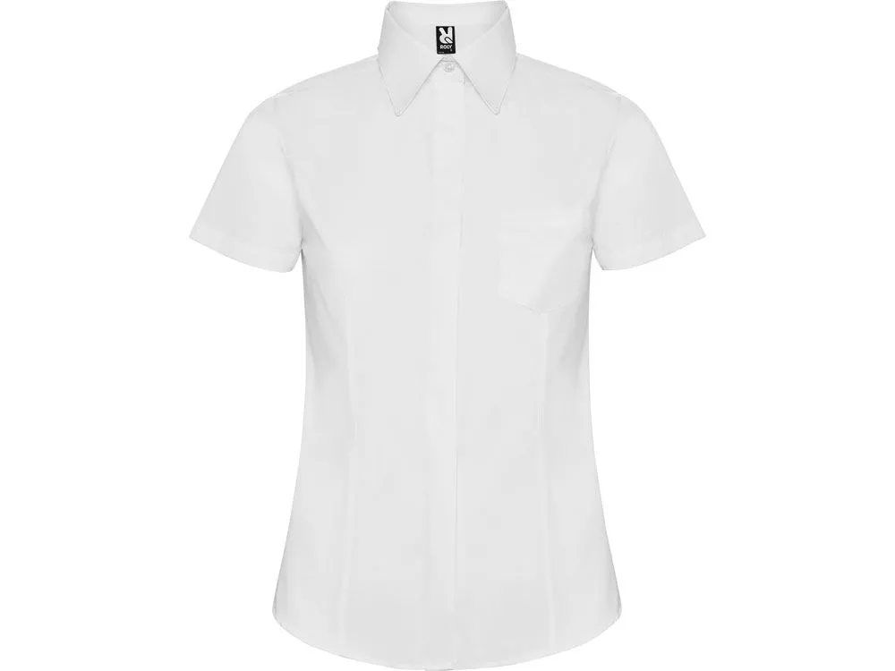 Рубашка женская прилегающего силуэта с вытачками на полочке и спинке с коротким рукавом. Накладной карман на груди слева, закругленный низ изделия. Планка с потайными пуговицами.