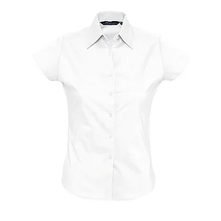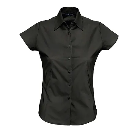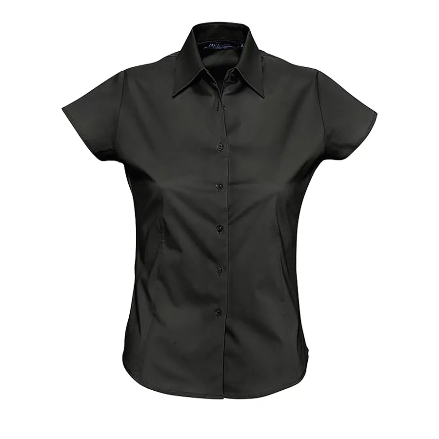 Женская рубашка с коротким рукавом из ткани стрейч. Приталенный крой. Планка на 7 пуговиц в тон изделия. Вытачка спереди и на спинке.