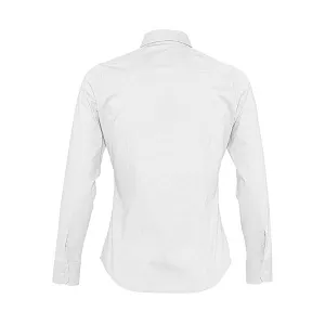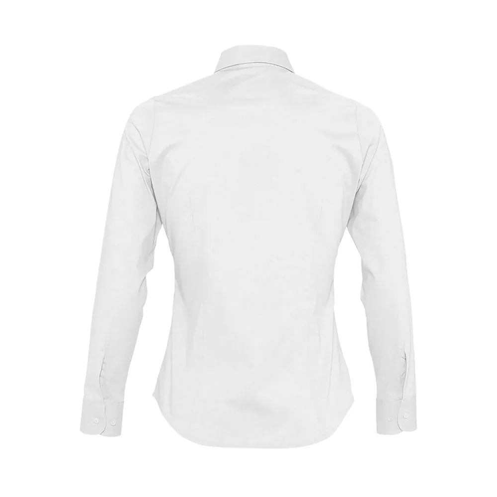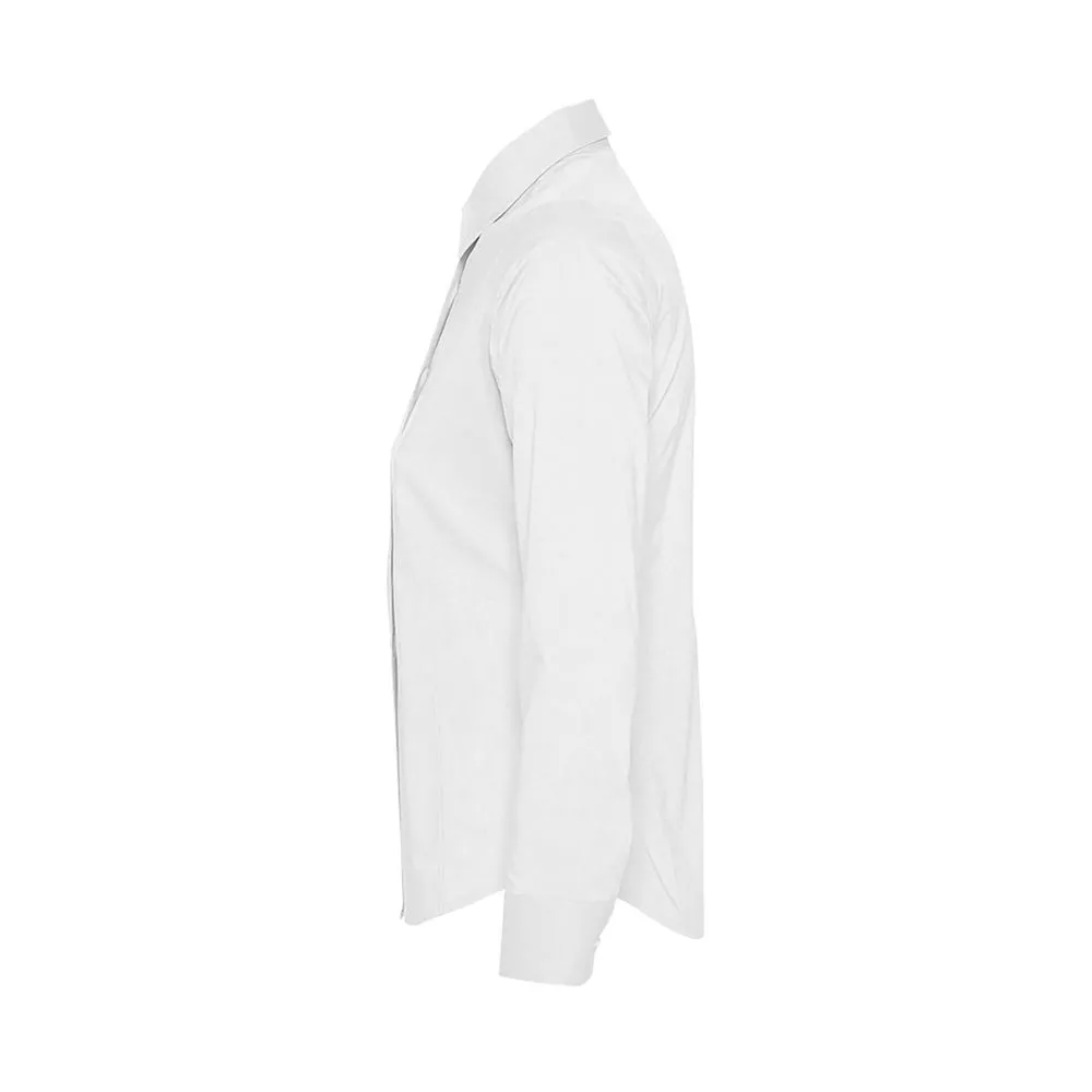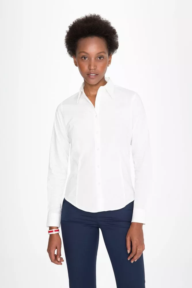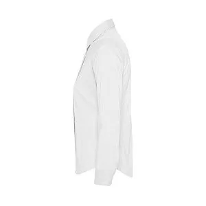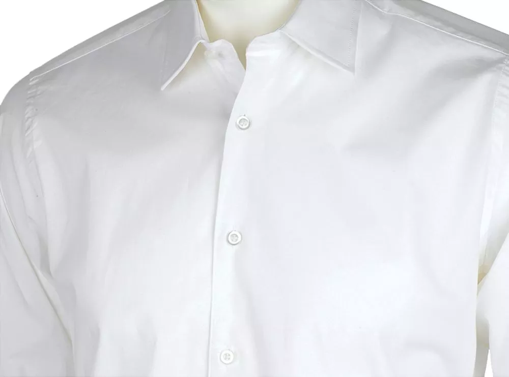 Рубашка приталенного кроя с воротником на одной пуговице. Планка на 7 пуговиц в тон, манжеты на 2 пуговицах, вытачки спереди и на спинке.