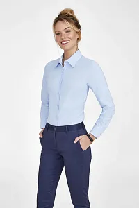 Рубашка из ткани «Оксфорд». Вытачки на груди, классический воротник, регулируемые закругленные манжеты, планка с семью пуговицами в тон.