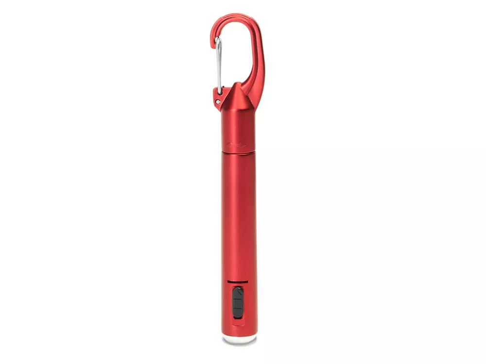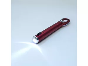 Ручка со светодиодным фонариком, доступна в различных цветах с металлическим покрытием и черной кнопкой. Встроенный карабин. Синие чернила
