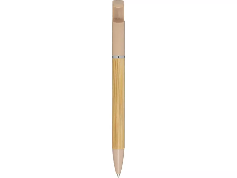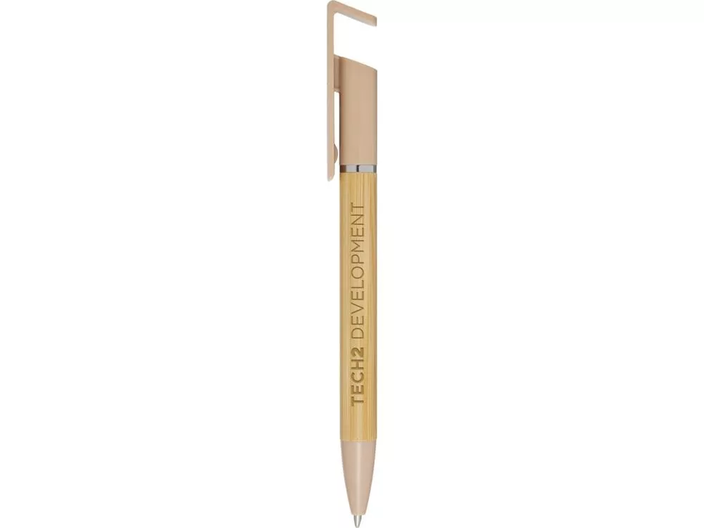 Бамбуковая шариковая ручка, которая также может служить подставкой для телефона. Кнопка и среднее кольцо изготовлены из переработанного пластика, наконечник — из латуни, а корпус — из бамбука, полученного из ответственных источников. Цвет чернил: черный. Длина непрерывной линии: 1000 метров. Размер пера: 1,0 мм. FSC certified bamboo. FSC Mix Credit N5 CU-COC-877277.