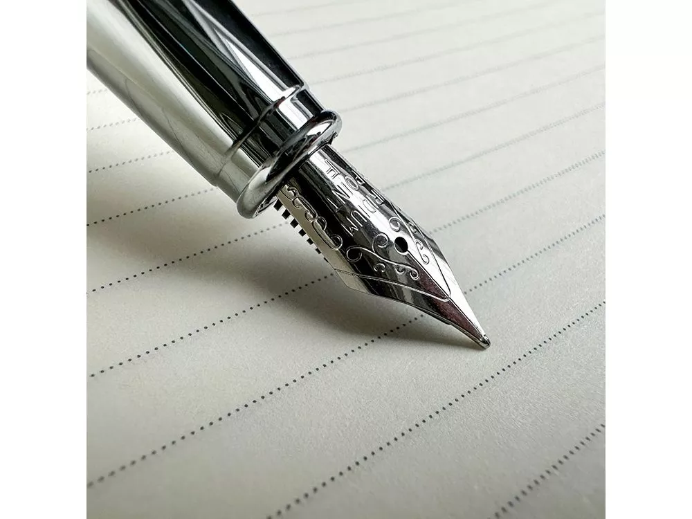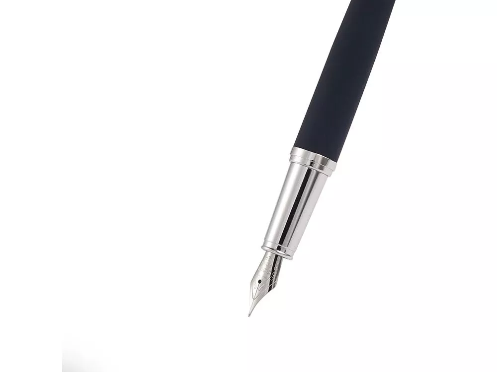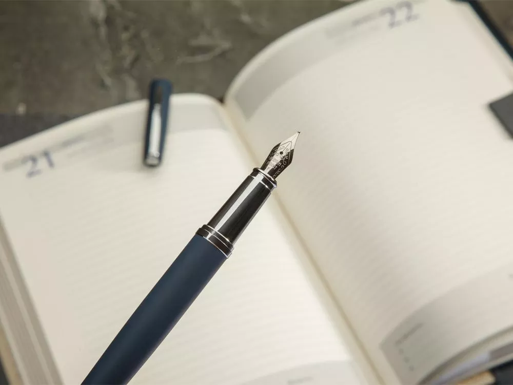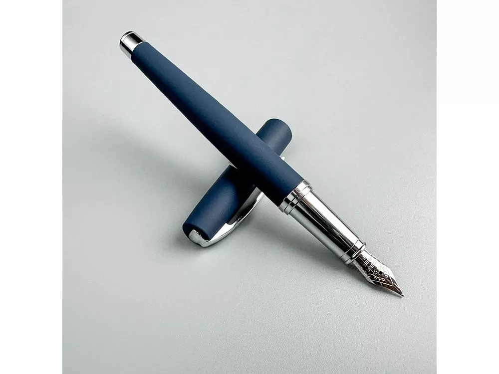Cтильная перьевая ручка Sienna от Bruno Visconti синего цвета с контрастирующими элементами в цвет серебра. Благодаря покрытию Soft Touch пальцы не скользят по корпусу ручки, письмо комфортное и легкое. Ручка оснащена высококачественным механизмом подачи чернил, благодаря которому линия остается однородной и аккуратной. Чернила не токсичны, на основе водорастворимого красителя, не забивают фидер. Перьевой наконечник выполнен из иридиума и дополнен орнаментом. Гравировка (оптоволоконный лазер) (Без чернения) на данный товар осуществляется бесплатно. Оплачивается только настройка оборудования в размере 1100 рублей на весь тираж.