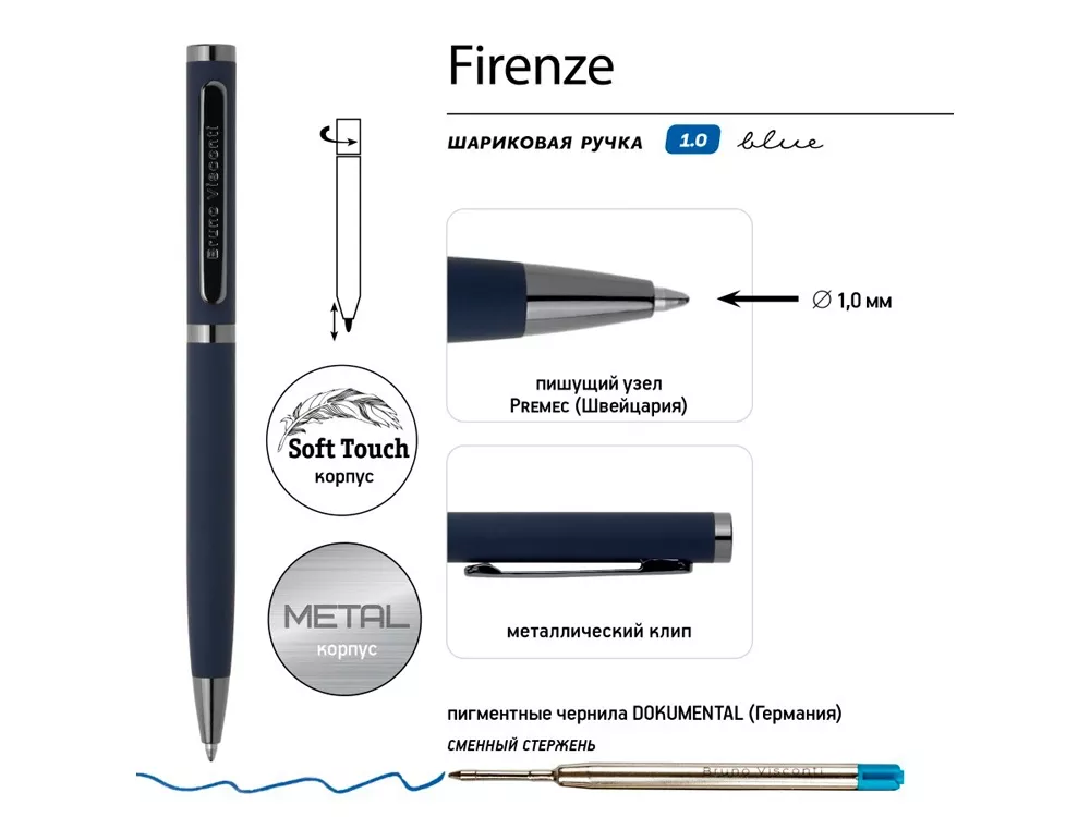 Шариковая металлическая ручка из коллекции Firenze от Bruno Visconti - бизнес-аксессуар, с которым вы всегда будете чувствовать себя уверенно и комфортно. Лаконичный дизайн, прочный металлический корпус, строгость формы подчеркнут статус владельца ручки. Удобство в эксплуатации и тактильно приятные ощущения подарит бархатистое покрытие Soft Touch. Ручка автоматическая, с легким поворотным механизмом подачи стержня. Надежный пишущий узел d 1,0 мм (от швейцарского производителя Premec) гарантирует высокое качество также, как и пигментные чернила Dokumental (Германия). Благодаря им писать ручкой Firenze одно удовольствие – она мягко скользит по поверхности бумаги, оставляя ровную, четкую линию. Гравировка (оптоволоконный лазер) (Без чернения) на данный товар осуществляется бесплатно. Оплачивается только настройка оборудования в размере 1000 рублей на весь тираж.