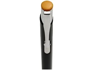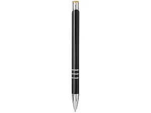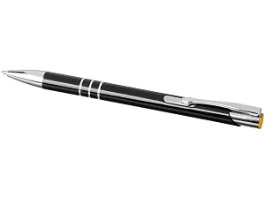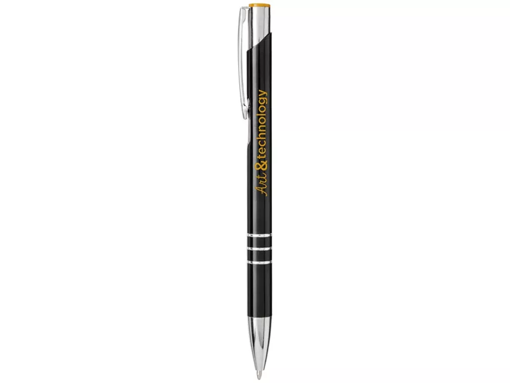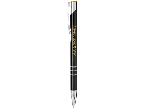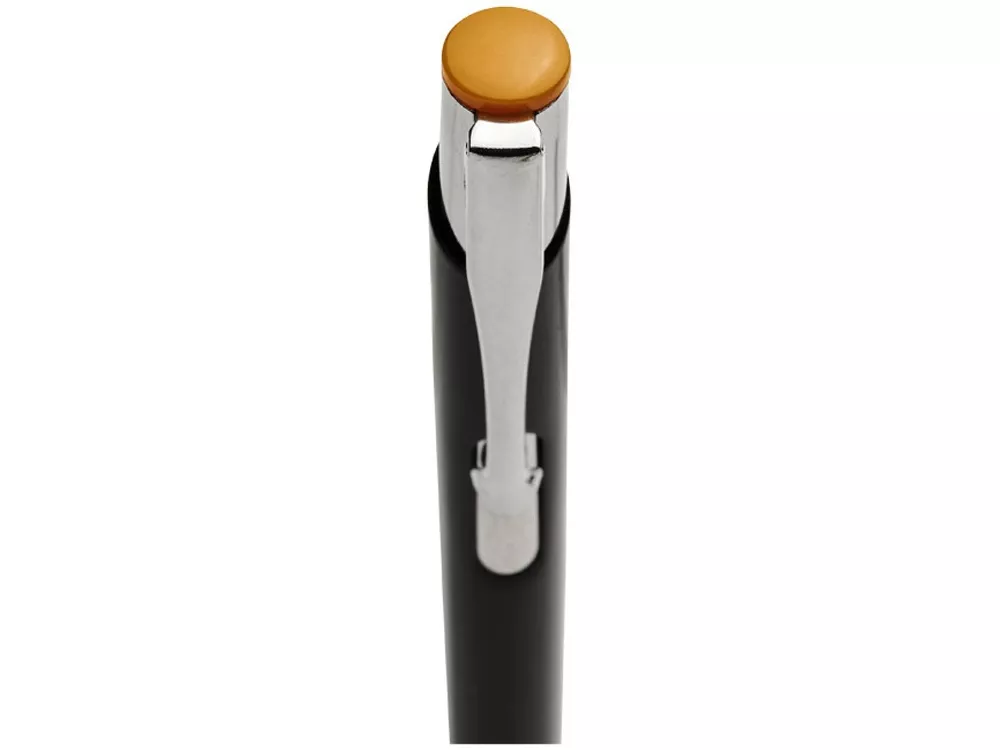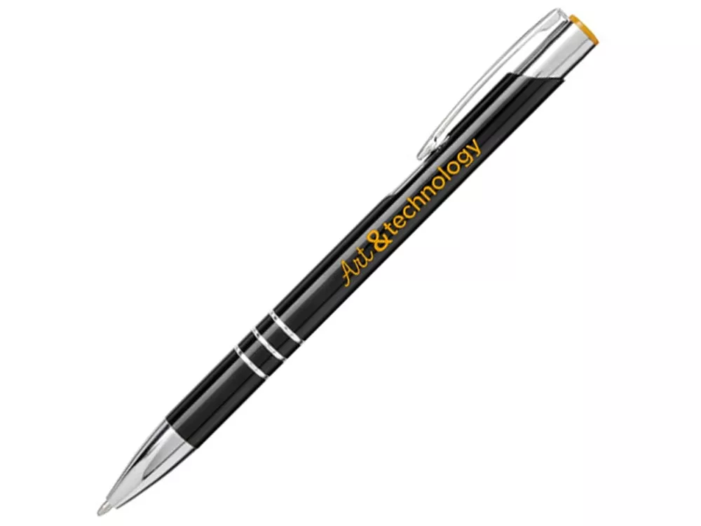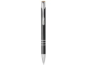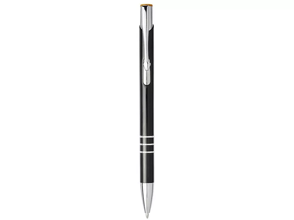 Черная шариковая ручка с кнопочным механизмом. Цвет кнопки совпадает с цветом гравировки. Ручка облачена в алюминиевый корпус и оснащена кончиком и верхней частью из АБС-пластика и металлическим зажимом.