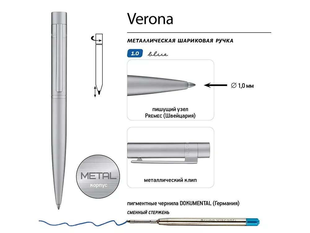 Металлическая шариковая ручка Verona - аксессуар, призванный стать настоящим элементом стиля, подчеркнуть индивидуальность его владельца. Как и все подарочные ручки Bruno Visconti, Verona - обладательница стержня с пишущим узлом от швейцарского производителя Premec и перманентными чернилами немецкого производителя Dokumental. Поэтому можно быть абсолютно уверенным в качестве письма. Сам стержень легко и бесперебойно выдвигается за счет мягкого поворотного механизма подачи. В ручке нет ничего лишнего, но она привлекает к себе внимание. Несмотря на увеличенный диаметр корпуса - 12 мм, она изящна благодаря плавным линиям, эргономичному серебристому корпусу, Гравировка (оптоволоконный лазер) (Без чернения) на данный товар осуществляется бесплатно. Оплачивается только настройка оборудования в размере 1100 рублей на весь тираж.