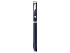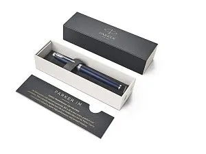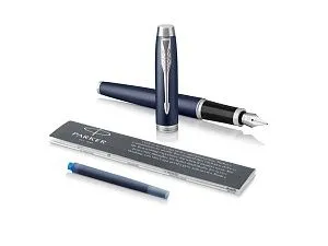 Перьевая ручка Parker IM из обновленной коллекции IM. Основные особенности нового дизайна: новый зажим-стрела с тремя широкими перьями, укороченная форма торца на колпачке, широкое кольцо на колпачке теперь состоит из 3 соединенных вместе колец, на среднем выполнена гравировка логотипа PARKER. Корпус перьевой ручки выполнен из латуни и покрыт многослойным матовым покрытием синего цвета, отдельные детали дизайна покрыты хромированной латунью, зона захвата изготовлена из блестящего пластика. Перьевая ручка оснащается пером из нержавеющей стали в новой привлекательной форме.