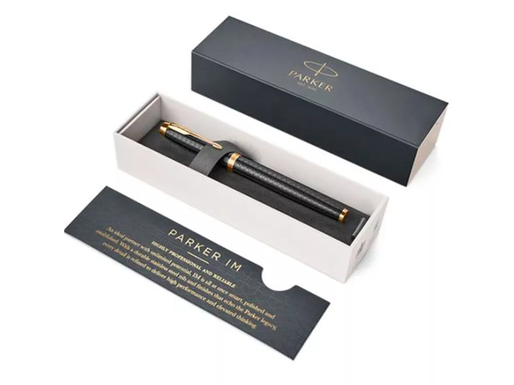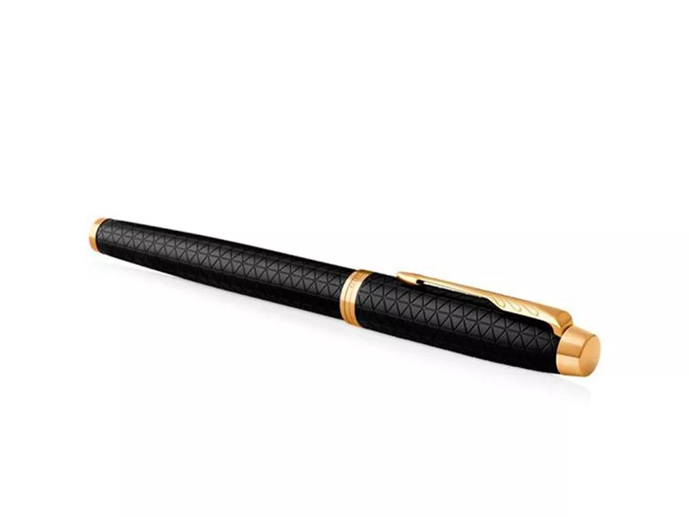 Ручка перьевая Parker IM Premium Black GT из обновленной коллекции IM. Основные особенности нового дизайна: новый зажим-стрела с тремя широкими перьями, укороченная форма торца на колпачке, широкое кольцо на колпачке теперь состоит из 3 соединенных вместе колец, на среднем выполнена гравировка логотипа PARKER. Корпус ручки выполнен из черного матового анодированного алюминия, прошедшего пескоструйную обработку, с фирменной гравировкой в виде стильного графического орнамента. Отдельные детали дизайна покрыты золотом.