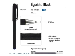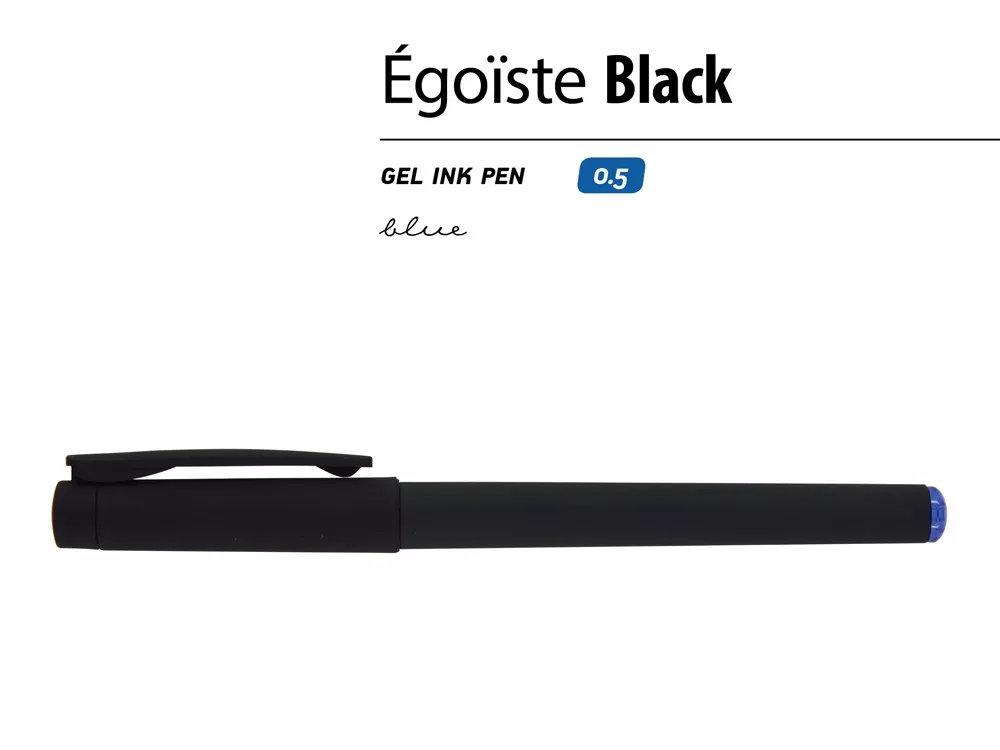 Линия гелевых ручек Egoiste выпускается в эргономичных округлых корпусах утолщенного диаметра. Современное антискользящее покрытие черного корпуса на ощупь напоминает прорезиненные поверхности или карбон. Повышенная прочность достигается за счет металлизированного наконечника, в котором закреплен пишущий узел Premec (Швейцария) толщиной 0,5 мм. В стержнях использованы японские чернила Mikuni синего цвета.