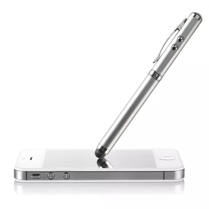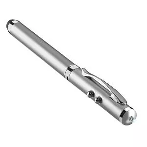Многофункциональная металлическая шариковая ручка. Синие чернила, белый светодиод , красный лазерный указатель. 3 батареи включены. Поставляется в металлической коробке.