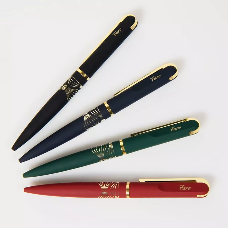 Глубокий насыщенный оттенок и бархатистая поверхность ручки FARO создают благородный контраст с отделкой цвета желтого золота. Оригинальный клип, скругленный в верхней части, напоминает о роскошных украшениях и символах власти. Это прекрасный выбор как для именного подарка бизнес-партнеру, так и для рекламы собственного бренда. Нижняя часть ручки выполнена из латуни, при гравировке софт-тач покрытия вскрывается зеркальная подложка в цвет отделки. Верхняя часть ручки - из пластика с золотистой подложкой, гравировка возможна на определенных настройках. Pantone, близкий к 188С. Стержень Metal Cross, толщина пишущего узла 1 мм, синие чернила Dokumental. Угол поворота корпуса: 270°