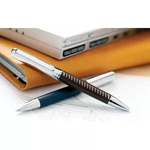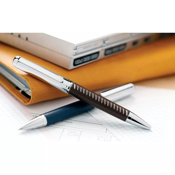 Металлическая шариковая ручка с отделкой из искусственной кожи в алюминиевом тубусе. Черные чернила.