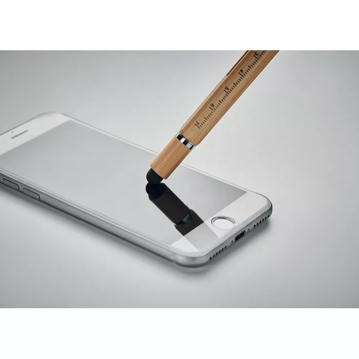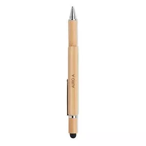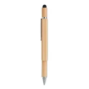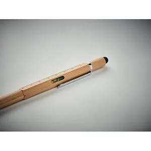 Бамбуковая ручка с уровнем, линейкой 7 см, стилусом, насадками для шурупов с крестообразной и плоской головкой. Синие чернила.
