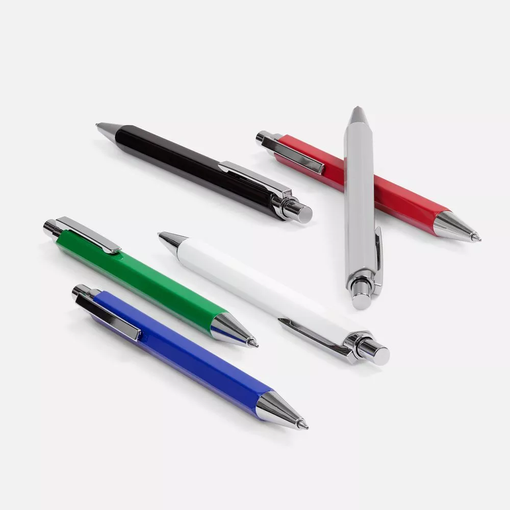 Металлическая шариковая ручка в глянцевом шестигранном корпусе с хромированными деталями.