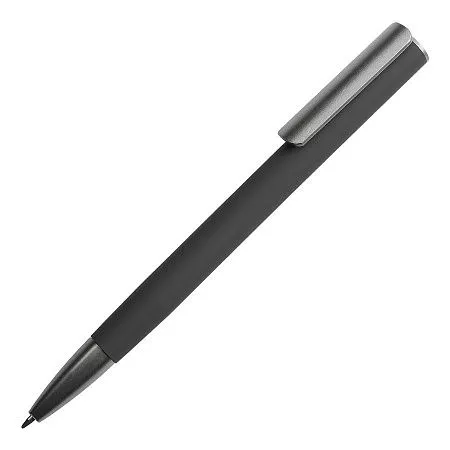 Интересная шариковая ручка из алюминия. Корпус soft touch. Отделка metal gun. Носик и клип пластиковые. Клип очень широкий. Он же - нажимной механизм подачи стержня. Гравировка вскрывает как зеркальную хромированную подложку, так и обычный цвет алюминия. Возможен 3D эффект, если в дизайне объединить 2а вида гравировки.