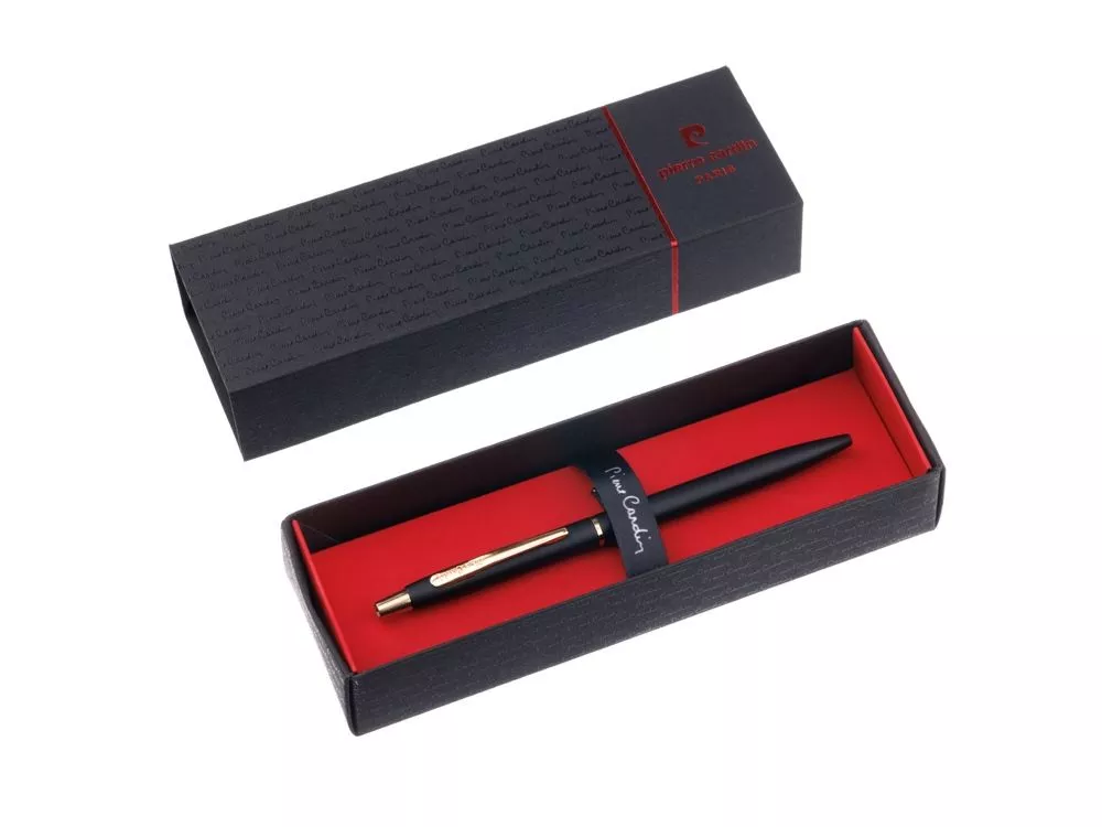 Шариковая ручка Pierre Cardin GAMME • Корпус - латунь. Цвет - черный; • Отделка - матовая; • Детали дизайна - золотистого цвета; • Упаковка - картонная коробочка черного цвета с картонным ложементом красного цвета; • Размер упаковки -175 х 55 х 35 мм, вес 35 гр Комплектация: • Металлический шариковый стержень с логотипом Pierre Cardin на корпусе с чернилами синего цвета; • Инструкция по использованию ручки. Экономичные ручки Pierre Cardin серии GAMME - прекрасное начало для больших дел! Большое всегда начинается с малого! Широкая гамма отделок и элементов дизайна, разнообразие форм и размеров, неповторимое сочетание стилей все это создает новый уровень элегантности по доступной цене.