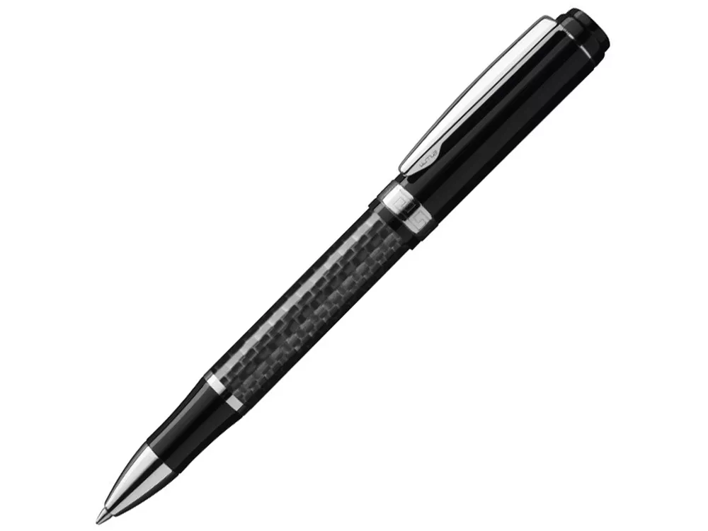 Шариковая ручка из карбонового волокна с поворотным механизмом, металлической фурнитурой с глянцевой хромированной отделкой.