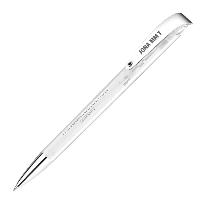 Jona MM Transparent – что скажет такая ручка с вашим логотипом? Прозрачный корпус ручки – вы ведёте бизнес чисто, прозрачно, честно. Блестящий металл наконечника и клипа ручки – ваш бизнес крепкий и устойчивый с блестящими перспективами развития.
