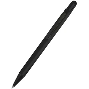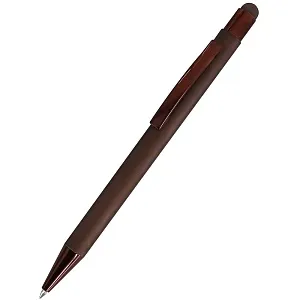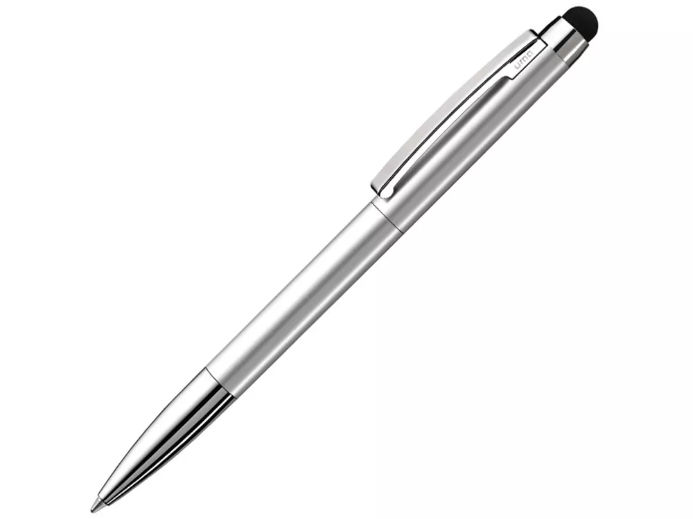 Металлическая шариковая ручка с поворотным механизмом и пружинным клипом. Поверхность серебристого матового цвета, фурнитура глянцевая с сенсорной функцией в верхней части.