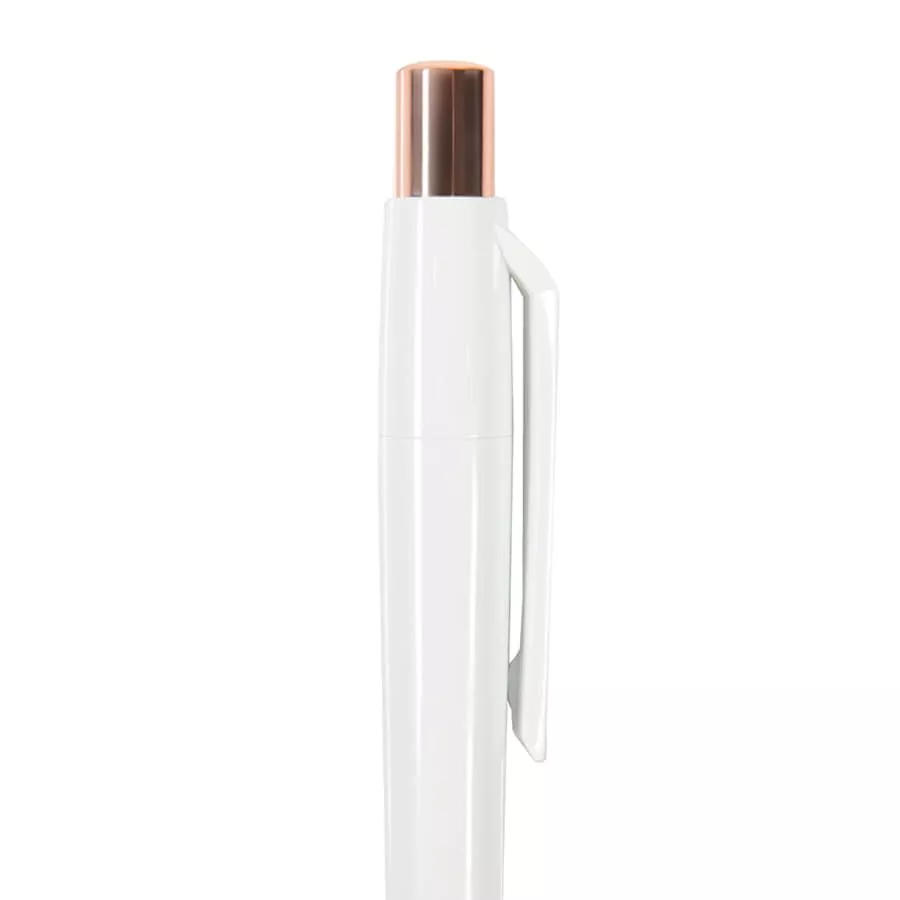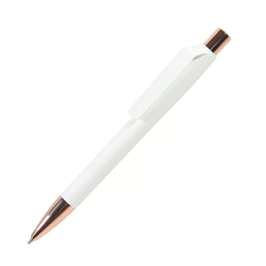 Элегантная ручка Mood - символ благородной роскоши и отражение актуальных тенденций мира дизайна. Ручка обладает приятной тяжестью, свойственной металлическим ручкам, и комфортно лежит в руке благодаря плавной обтекаемой форме корпуса. Широкий клип и корпус обеспечивают большое поле для нанесения логотипа, а высококачественный ABS-пластик гарантирует его стойкость и великолепный внешний вид ручки. Металлические носик и кнопка с зеркальным покрытием "под розовое золото". Процесс обработки металлических деталей проходит под тщательным индивидуальным котролем, что гарантирует гладкость и безупречный блеск покрытия. Цвет корпуса, близкий к Pantone White C. Стержень Plastic Parker type, пишущий узел 1.0 мм, синие чернила Dokumental, до 4000 м письма. Производство : Италия