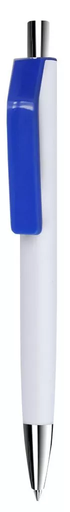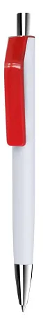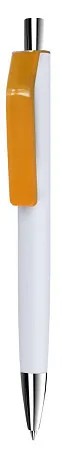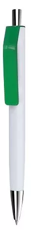 Шариковая ручка в корпусе из глянцевого пластика белого цвета. Клип контрастного цвета. Наконечник и кнопка с хромированным покрытием.