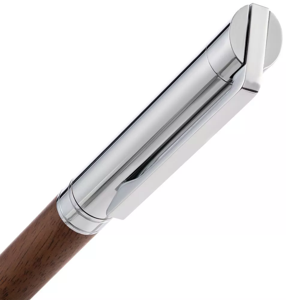 Шариковая ручка в деревянном корпусе с металлическими деталями.