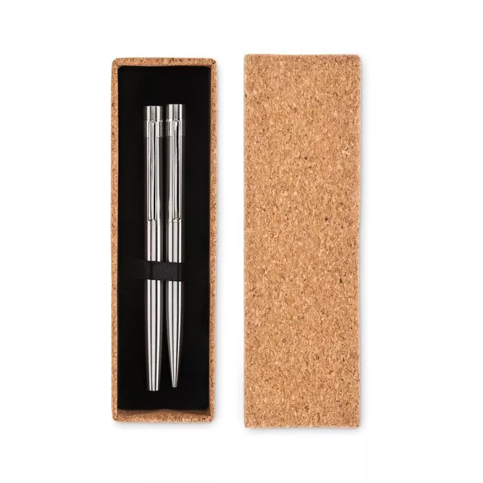 Набор ручек из переработанной нержавеющей стали с шариковой ручкой и шариком-роллером. Поставляется в подходящей пробковой коробке. Синие и черные чернила соответственно.