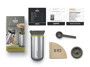 Портативная капельная кофеварка Wacaco Cuppamoka для фильтр кофе. В комплект входит: изотермическая кружка из нержавеющей стали (300 мл), коллектор, 10 бумажных фильтров, мерная ложка, инструкция. Гравировка (оптоволоконный лазер) (Без чернения) на данный товар осуществляется бесплатно. Оплачивается только настройка оборудования в размере 1100 рублей на весь тираж.