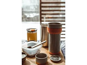 В комплект входит: мягкая сумка-чехол, емкость для кофе 16г, мерная ложка для кофе 8г, крышка, кольцо управления, емкость для воды 300мл, воронка, кисточка для чистки.