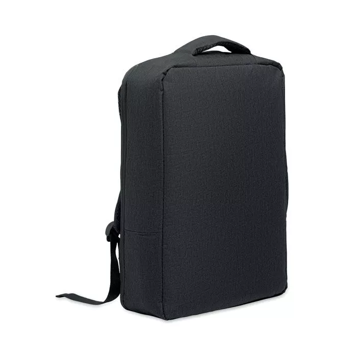 Тонкий рюкзак для ноутбука с диагональю 15 дюймов из переработанного материала 300D RPET и подкладкой из 210D RPET. Включает отделение для ноутбука, 2 внутренних кармана, 2 внутренних отделения для ручек и 2 мягкие ручки для переноски. Спинка и плечевые ремни с мягкой подкладкой. Крепление для чемодана на обратной стороне.