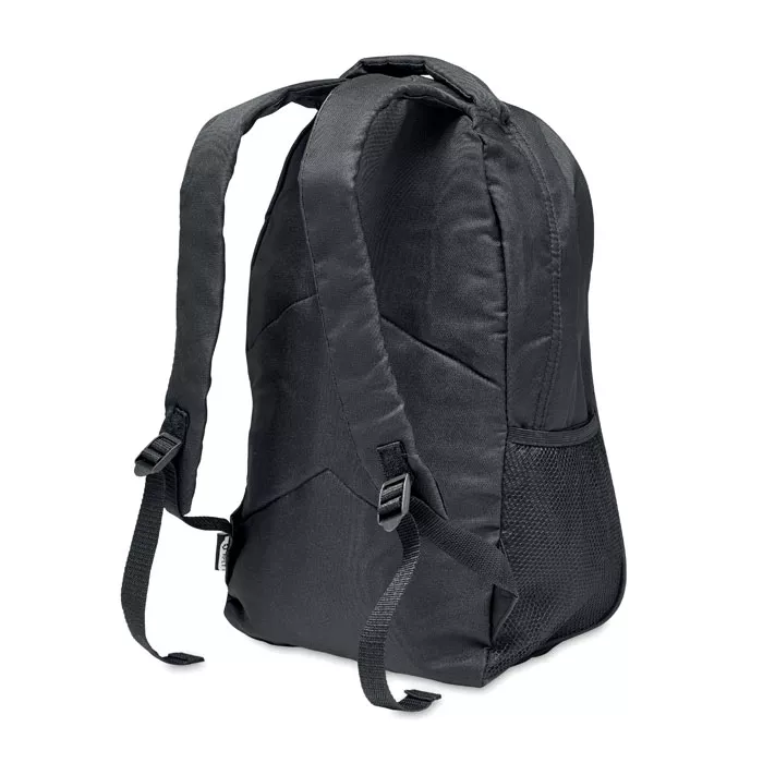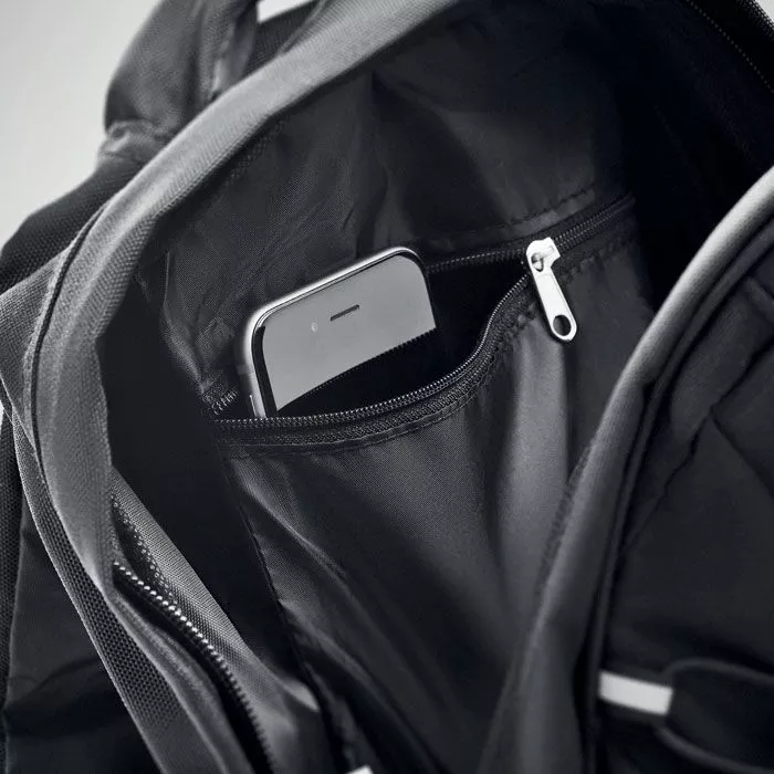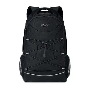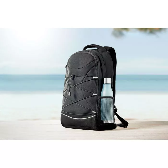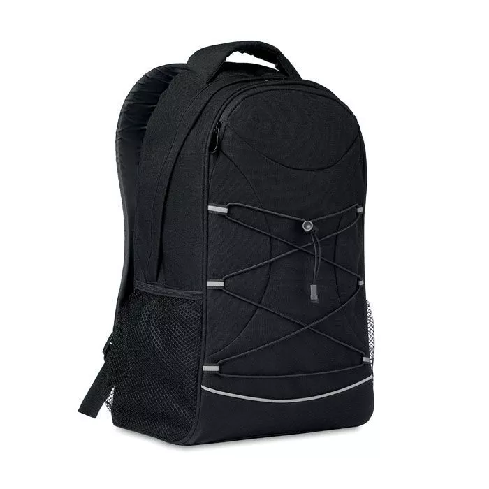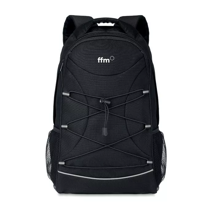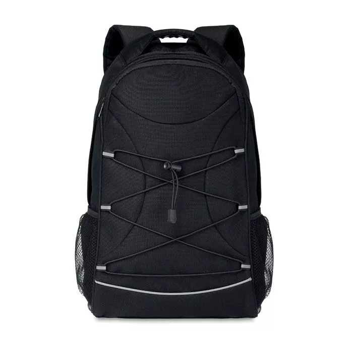 Рюкзак из RPET 600D с темными шнурками спереди и светоотражающей передней панелью. Сетчатые карманы с двух сторон.