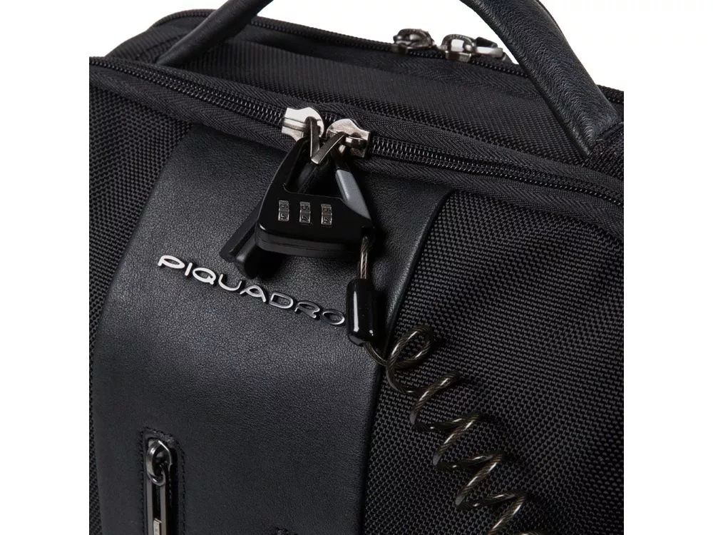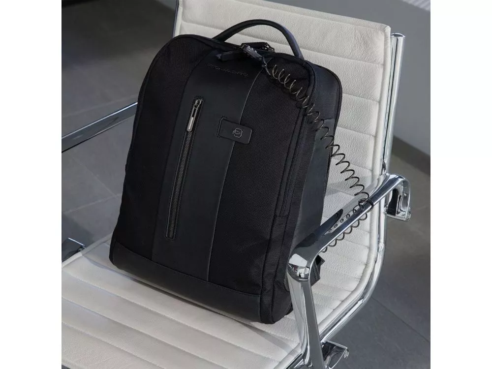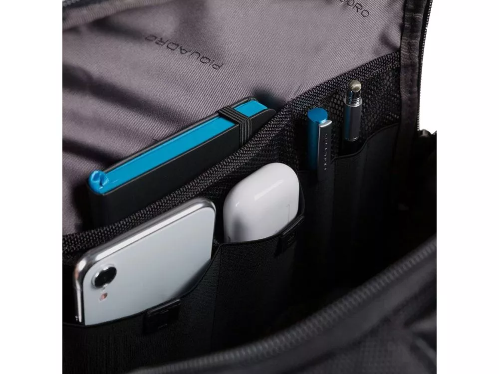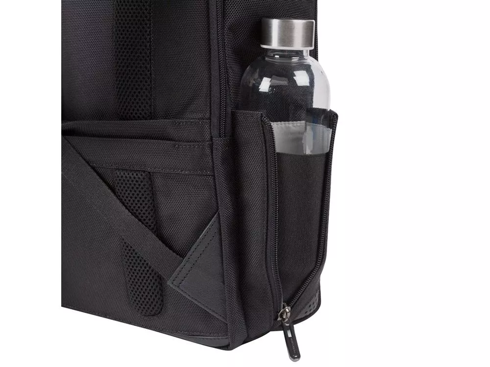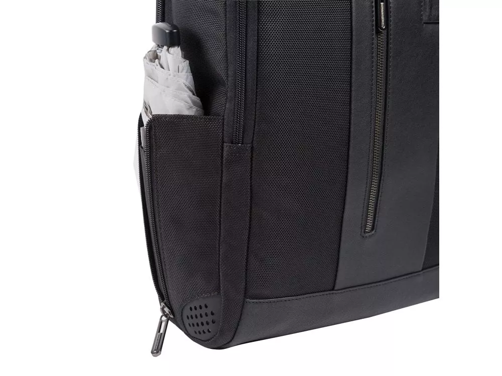 Рюкзак из переработанного текстиля с отделениями для ноутбука и iPad®, радиочастотной защитой и противокражным тросом - мягкое отделение для ноутбука 15,6 - отделение для iPad® 10,2'', iPad® Air 10,9'', iPad®Pro 11'' - внутренний карман для мобильного телефона - карман для AirPods® - складной карман для бутылки - карман для зонта - петля для ручки - карман для мелких предметов - отстегиваемая адресная бирка - ремень для крепления на ручке чемодана