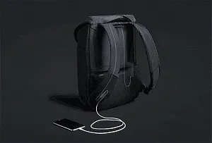 - 3 открытых кармана под мелочи, один из которых с кабелем USB для зарядки, соединенным с портом на внешней стороне рюкзака