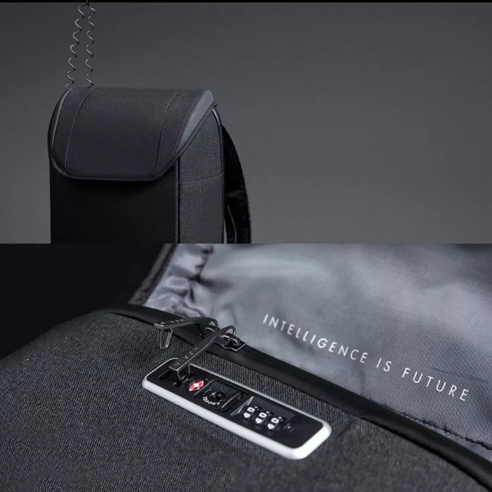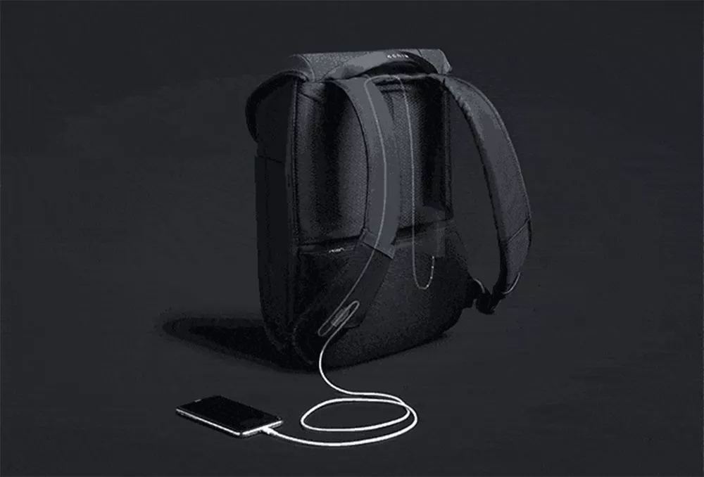 - 3 открытых кармана под мелочи, один из которых с кабелем USB для зарядки, соединенным с портом на внешней стороне рюкзака