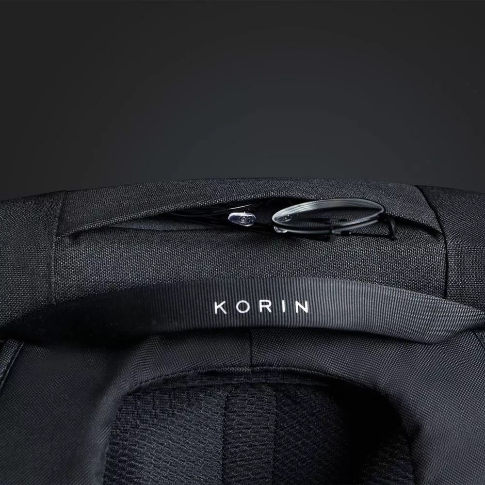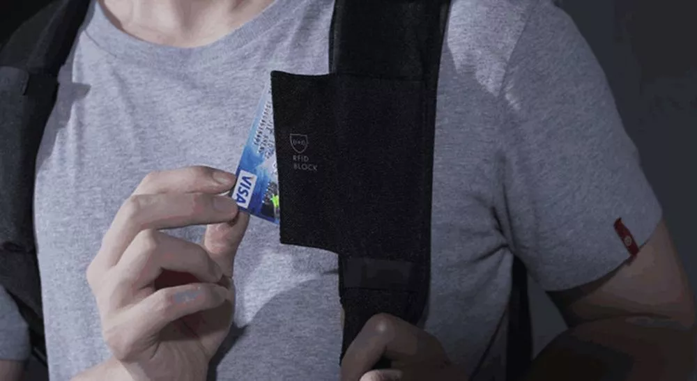 - На правой лямке рюкзака находится USB-порт, на левой — карман на липучке с двумя отделениями с RFID-защитой для карточек и ключей