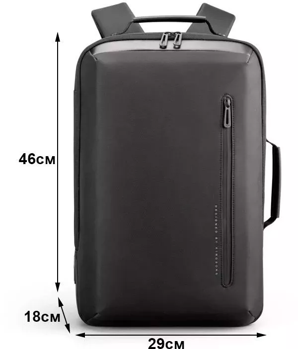 Вместительный рюкзак с двумя отделениями, выполненный в компактных размерах. Внутрь, помимо документов, гаджетов и аксессуаров, поместится ноутбук диагональю 15.6 дюймов. У него не одна ручка, а две: сверху и сбоку. Благодаря этому, его можно носить не только как рюкзак, но и как сумку. На лицевой стороне расположен карман на влагозащитной молнии, а на спинке – потайной для вещей, которые необходимо всегда держать под рукой. На торце находится внешний USB-порт, чтобы вы могли быстро подключать телефон к повербанку, не копошась внутри забитого вещами рюкзака. А на спинке – широкая лента для крепления рюкзака-сумки на выдвижной ручке чемодана.