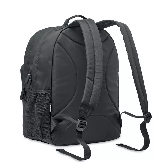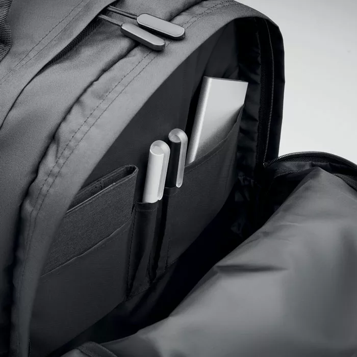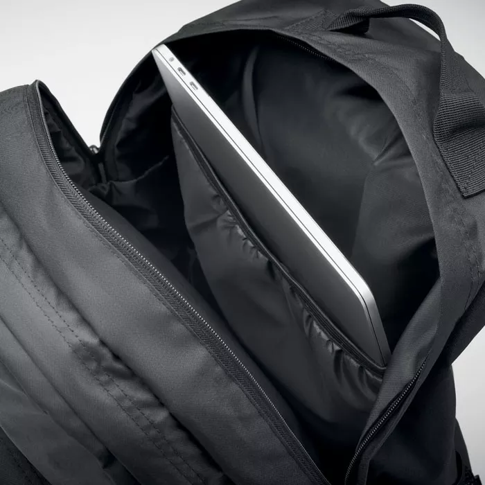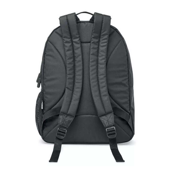 Рюкзак для ноутбука 15 дюймов из полиэстера 300D RPET. Имеет 2 больших отделения на молнии, двойные передние карманы на молнии и сетчатый боковой карман. Спинка, дно и плечевые ремни с мягкой подкладкой