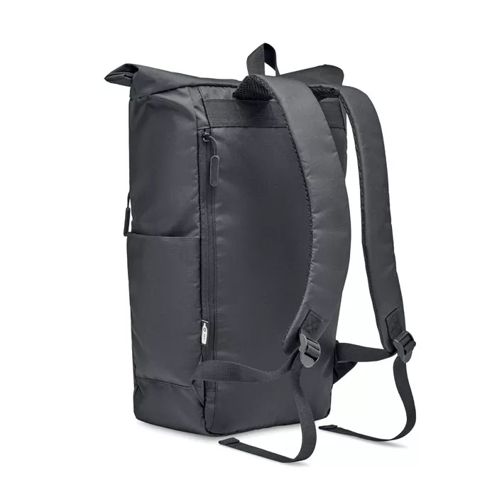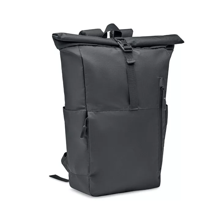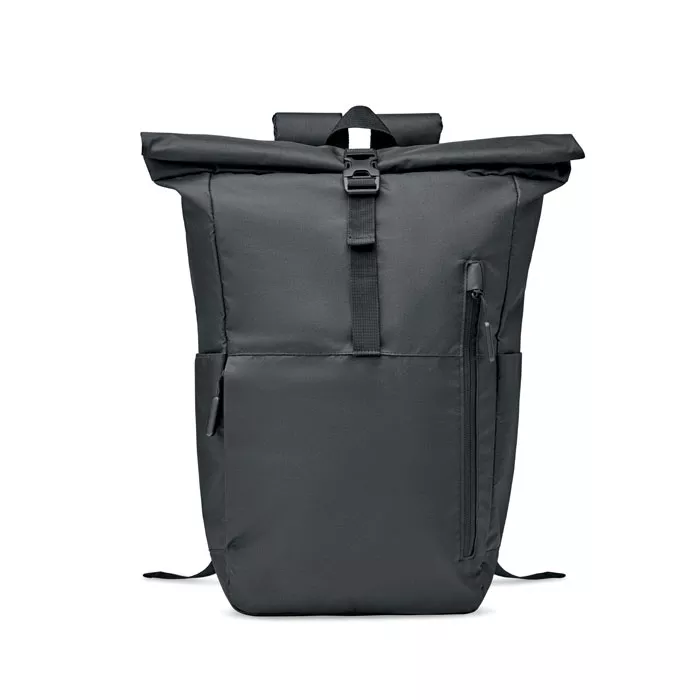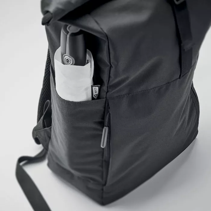 Рюкзак для ноутбука 15 дюймов с застежкой rolltop из полиэстера 300D RPET. Большой передний карман на молнии, скрытый боковой карман с небольшой петлей для карабина внутри. Карабин не предназначен для скалолазания.