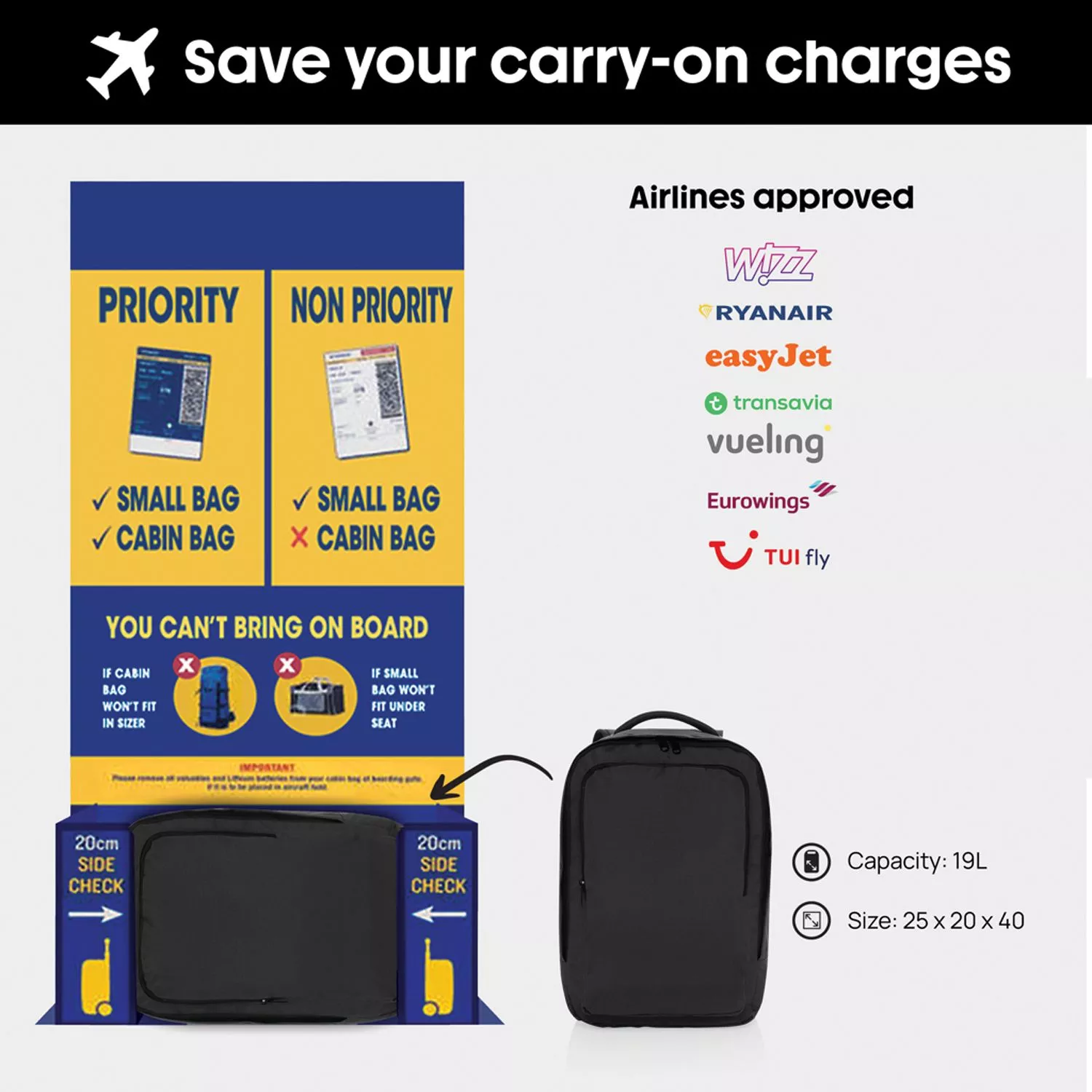 Есть багажный ремень для крепления на ручку чемодана. Объем 19 л позволяет разместить рюкзак под любым авиакреслом и избежать дополнительных сборов за багаж. Материал изделия содержит индикатор AWARE™, наличие которого гарантирует подлинность переработки и контроль всей цепочки поставок. 2% от продажи каждого товара с AWARE™ отчисляем в поддержку организации Water.org. Не содержит ПВХ.