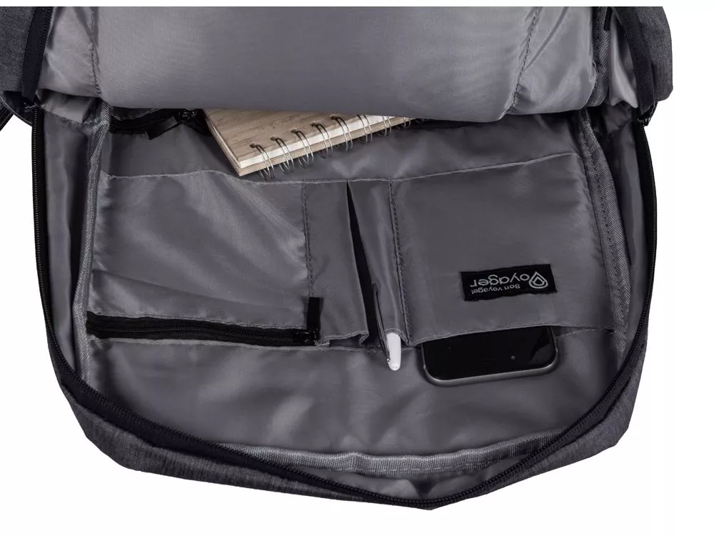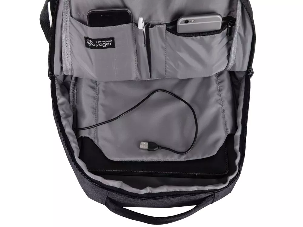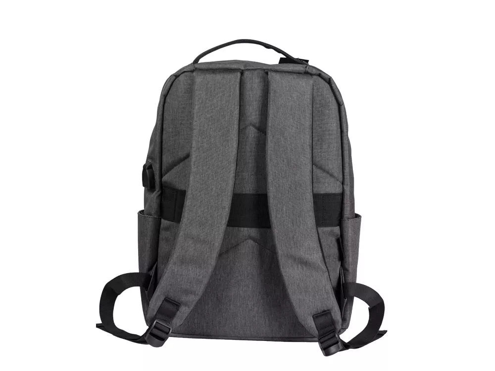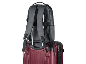Отличный функциональный бизнес-рюкзак оснащен всем необходимым: - 2 боковых наружных кармана - наружный вертикальный карман - внутри карман для ноутбука 15 - органайзер с карманами на молнии - USB выход - ремень для крепления на чемодан - регулируемые по длине лямки Трафаретная печать (1 цвет (цветные изделия)) на данный товар осуществляется бесплатно. Оплачивается только настройка оборудования в размере 8200 рублей на весь тираж.
