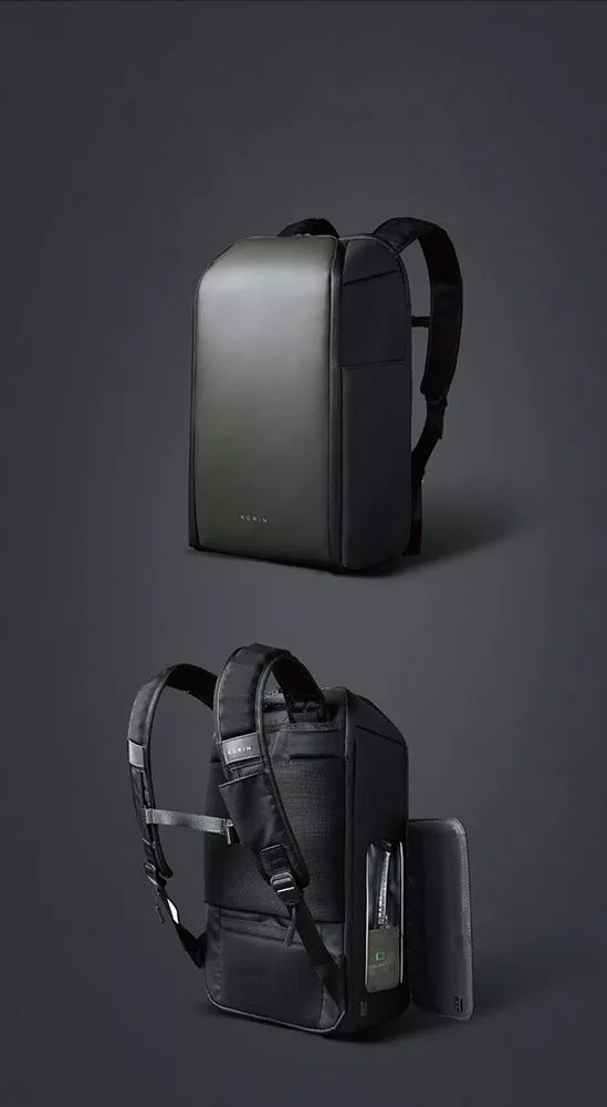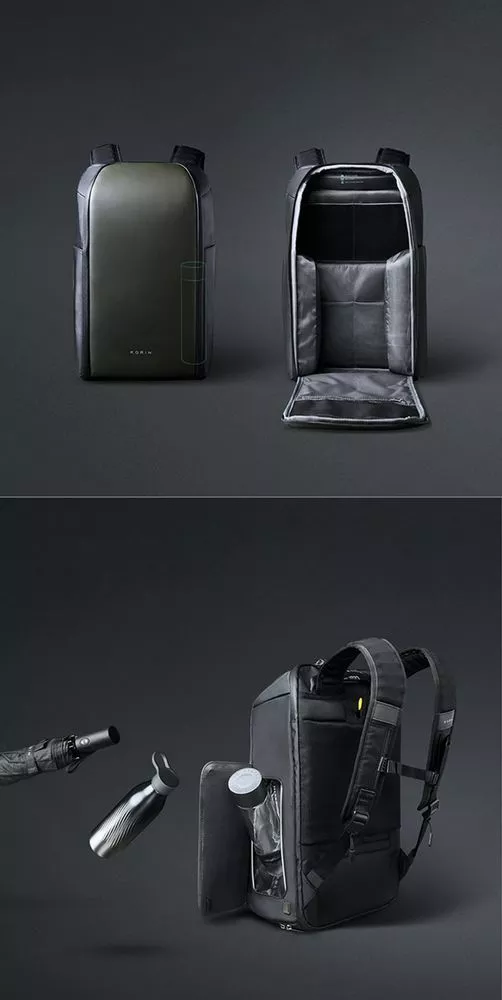 - 2 боковых кармана с быстрым доступом благодаря клапанам на сильных магнитах: один карман с дополнительной специальной водозащитой для термокружки, бутылки с водой или зонта, второй карман для мелкой электроники с дополнительной регулируемой мягкой перегородкой на липучке