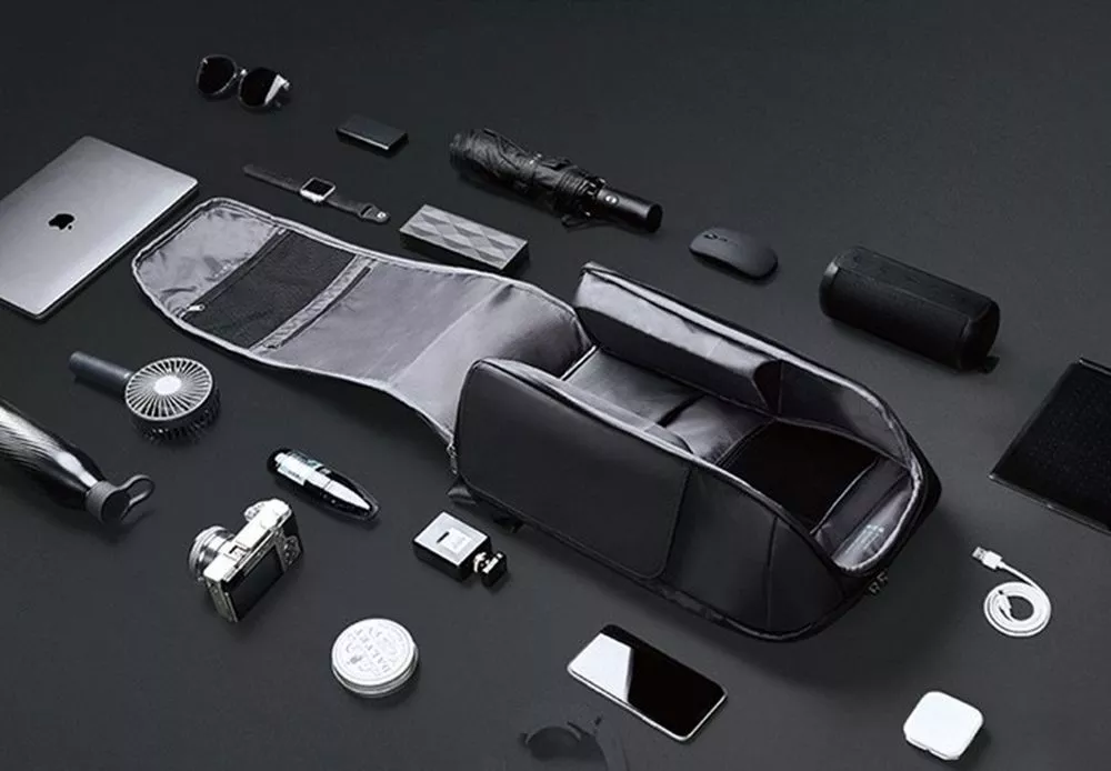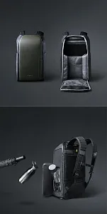 - В основном отделении 7 карманов: на спинке 4 открытых кармана и 1 на молнии, 2 кармана на молниях на откидной крышке, один из которых с портом USB для зарядки